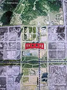 ![]() Overview plan shows central axis to Lianhua Hill. Strong central axis design was cited as one of the main reasons the design was chosen. Also, the master plan was flexible enough to accommodate future additions and a variety of different buildings. |