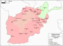 Military situation in Afghanistan in 2000, between the Taliban (green) and the Northern Alliance (blue)