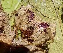 The first described female had a total length of 15.8 mm, with a carapace length of 3.8 mm and an abdomen length of 12.6 mm – the abdomen partly covered the carapace. The carapace was slightly wider than long, with a maximum width of 3.9 mm. The carapace was yellowish brown with a complex dark brown pattern and covered with long white wool-like setae. The head region had four tubercules: a short one at the front, then a longer one, and then a pair of shorter ones. The eyes were arranged in two slightly recurved rows. The sternum was cream coloured. The abdomen was creamish yellow, shaped like a backward pointing triangle with five tubercules at each front corner and six at the back. Each tubercule had a darker tip and a tuft of long white setae. The first leg was longest, 14.7 mmm. The spider's legs were creamish white with dark spiral-shaped bands on the femora, patellae and tibiae and longitudinal bands on the metatarsi. The epigyne had no scape, only a small rounded lip. The male was unknown.[2]