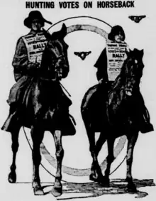 During her work and educational experience, Elliman joined the suffrage movement and started her journey as a political activist. She joined the Massachusetts Political Equality Union and became a member of the National American Women Suffrage Association (NAWSA). As a member of NAWSA she was responsible for publicizing a rally that was to be held at Tremont Temple. She chose to spread news of the event by riding a horse through downtown Boston with fellow suffragist, Linda Marston, to call attention to the movement and gain supporters for the rally.[1] Her work towards gaining supporters was wildly successful and inspired her to do the same thing on a larger scale. On July 2, 1914, Claiborne Caitlin began her horseback tour around Massachusetts to spread the word about women's suffrage.[3] She received money with a collection box that was passed around for donations, since she started the journey without any money. She was a well-known horsewoman and planned to ride a horse named Trixie, who had competed and won in many horse races across the country.[3][4] Claiborne packed very light because she was a minimalist, and only carried a raincoat and necessary feminine products in her saddlebag. She rode around in a khaki suit, leggings, and a sombrero with a feather. Her trip covered 530 miles, she visited 37 cities and organized 59 meetings along her trip.[3] She felt it gave her purpose in the movement and in politics that she didn't have before joining the suffrage movement. It also gave her exhilaration and camaraderie to be a part of the women's suffrage movement.[5]