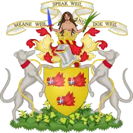 The Urquhart chief's coat of arms features three erased red boar heads on a yellow shield.[6] The shield is supported by two leased greyhounds, standing upright on their hind legs on top of a lawn of wallflowers.[6] Above is the shield, is the crest–coronet or knight's helmet, surrounded by red and yellow wallflower blossoms and topped by a crown.[6] A naked woman from the waist up emerges from a crest–coronet.[6] She holds an azure sword in her right hand and a palm sapling in her left hand.[6] She is surrounded by the clan motto on a curved scroll: Meane weil, speak weil, and doe weil.[6]