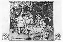 Women and children in Peck's work were depicted with great sensitivity in a wide variety of roles and responsibilities.[20] Art historian and illustrator Walt Reed describes Peck's style as "decorative in composition and sensitive in rendering".[7] Artistic themes found in Peck's work include education, child psychology, and the expectant mother.[7] The decorative style of the period was popularized by seminal American illustrator Howard Pyle and his female students.[26][27] According to Elizabeth H. Hawkes, curator emeritus of the Delaware Art Museum, the style consisted of "using flat, brightly colored figures boldly outlined and placed against a patterned background. They incorporated elements of the popular 1890s poster style and borrowed motifs from Walter Crane, Kate Greenaway, and the English Arts and Crafts movement style of illustration."[28]