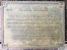 There is a plaque on the grounds of the Cleveland Public Library marking the location of Clara Morris' home when she was young. The plaque reads: "On this site, in her girlhood, lived Clara Morris. With limited opportunities she overcame privation and, in her twenties, was recognized as the leading emotional actress on the American stage."