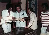 Wijewardena formed the Moonstones at the age of 21 with Annesley Malewana as lead vocalist.[7][5] Managed by an advertising icon, Sri Sangabo Corea, the group recorded several songs, which aired on the Saturday Star program in 1966. The young musicians were mentored by Sri Sangabo Corea, together with veteran Radio Ceylon/SLBC broadcasters Vernon Corea and Vijaya Corea. Their 1968 debut EP "Mango Nanda" was released on the JVPC007 Philips label selling up to 5,000 copies.[8] It included the songs Mango Nanda, Ruwan Puraya, Seetha Ude and Menike. Their second release "More Hits by the Moonstones" came out in November that year, on the Sooriya label and included the hits Kalu Mama, Rosa Male, Ramani and Goyam Kapanawa.[6] Later the song Mango Nanda was selected the best Sinhala song by the Hit Parade program on Radio Ceylon as well.[9] In 1969, the Moonstones welcomed female vocalist Indrani Perera who sang lead on the best selling hit Dilhani. Wijewardena himself only sang lead on Dileepa Podi Puthu an adaptation of a poem written by Karunaratne Abeysekera to his son.[5]