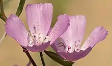 Clarkia dudleyana is a species of flowering plant in the evening primrose family known by the common name Dudley's clarkia. It is endemic to California, where it can be found in the mountains of the Transverse Ranges and the southern Sierra Nevada foothills. It grows in woodland, forest, and chaparral habitats under 1500 meters in elevation. This annual herb produces an erect stem sometimes exceeding half a meter in height. The leaves are lance-shaped, up to 7 centimeters long, and borne on short petioles. The top of the stem is occupied by the inflorescence, which has opening flowers below closed, hanging buds. As the flower blooms the pink to reddish-purple sepals remain fused, opening along one side only. The petals are up to 3 centimeters long, fan-shaped, pinkish lavender in color and sometimes flecked with red. There are 8 stamens, some of which have large lavender anthers and some that have smaller, paler anthers. The stigma protrudes farther than the stamens.