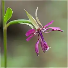 Clarkia rhomboidea is a species of wildflower known by the common names diamond clarkia and forest clarkia. This plant is native to western North America, where it is a common resident of varied forest and woodland habitats. This clarkia grows a spindly stem not exceeding a meter in height and occasional small leaves. The flower has four petals which are bright pink to lavender and often speckled with darker pink shades. The petals are diamond-shaped to spoon-shaped and one to one and a half centimeters long. There are eight stamens, each holding a large anther bearing blue-gray pollen.