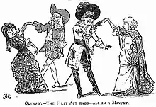 In 1670[9] at Newmarket Heath, Duval's gang of highwaymen are disguised as gypsy fortune-tellers, and local maidens come to have their fortunes told. Charles Lorrimore arrives; he has attached himself to the losing faction at court and is fleeing from arrest. The gang captures him, but Duval has met Lorrimore before and likes him. Lorrimore tells Duval that he is in love with Constance, the niece of the old miser McGruder, who has gained possession of the Lorrimore estate. Soon a coach bearing McGruder and his two nieces crosses the Heath and is waylaid by the gang.[10] Duval persuades Constance to dance a minuet with him and then she and her travelling companions are allowed to go on their way without further interference.