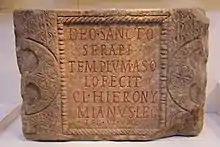 The stone inscription reads: DEO SANCTO / SERAPI / TEMPLUM A SO / LO FECIT CL(audius) HIERONY / MIANUS LEG(atus) / LEG(ionis) VI VIC(tricis)