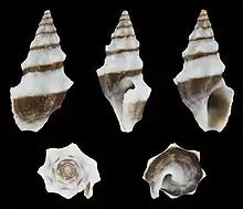 The white shell shows a broad chestnut band below the periphery. The tuberculations of the periphery are often long and spinose. Usually a revolving row of nodules appears below the middle of the body whorl.[3]