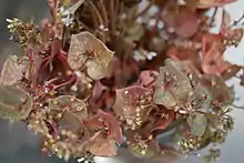 Claytonia rubra is a species of wildflower in the family Montiaceae known by the common names redstem springbeauty and erubescent miner's lettuce. It is native to western North America from southwestern Canada to the United States of America extending from The Black Hills and western slopes of the Rocky Mountains to the Cascade and Coast Range, Ochoco and Wallowa Mountains south to the Warner Mountains, Yolla Bolly Mountains, and Sierra Nevada and Transverse Ranges [Mt. Pinos and Mt. San Gorgonio], where it is found in coniferous forests and shrublands.[1] This is an annual herb with stems up to about 15 centimeters long. Some individuals may overwinter as biennials. The basal leaves have small rounded to diamond-shaped blades on long, tapering petioles. There are also leaves on the stem which may be rounded or squared and sometimes fuse together to create a bowl around the stem. All the leaves possess blunt (obtuse) tips according to published descriptions and taxonomic treatments. The herbage is red or pink in color at all stages of development. The inflorescence is a dense cluster of up to 30 tiny flowers, each with petals less than 4 millimeters long and white to pink-tinted in color. Together with Claytonia perfoliata and Claytonia parviflora, Claytonia rubra comprises what is almost certainly a polyploid pillar complex based on three diploid species, each occupying a definitive ecological niche.[2]