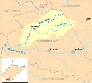 The Clear Fork is a tributary of the Guyandotte River, 29 miles (47 km) long,[3] in southern West Virginia in the United States. Via the Guyandotte and Ohio rivers, it is part of the watershed of the Mississippi River, draining an area of 129 square miles (330 km2)[4] in a rural area on the unglaciated portion of the Allegheny Plateau. The Clear Fork flows for its entire length in Wyoming County; its tributary the Laurel Fork also drains a small area of western Raleigh County.[5]