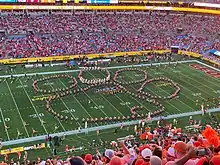 ![]() The Clemson University Tiger Band in the iconic Tiger Paw formation during their pregame performance at the 2021 Duke's Mayo Classic | |