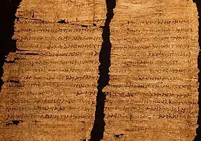 A papyrus document dated to February 33 BC, later used to wrap a mummy, contains the signature of Cleopatra, probably written by an official authorized to sign for her.[263][264] It concerns certain tax exemptions in Egypt granted to either Quintus Caecillius or Publius Canidius Crassus,[note 55] a former Roman consul and Antony's confidant who would command his land forces at Actium.[279][264] A subscript in a different handwriting at the bottom of the papyrus reads "make it happen"[279][264] or "so be it"[265] (Ancient Greek: γινέσθωι, romanized: ginésthōi);[note 56] this is likely the autograph of the queen, as it was Ptolemaic practice to countersign documents to avoid forgery.[279][264]