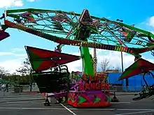 This device consist of a steel boom with a hinged end. Attached to the boom are hydraulic cylinder rams that push the boom upward about 75 degrees off a base trailer with supporting outriggers, or concrete set in. Attached to the opposite end of the boom the hitch is on, is a avon bearing in which a circular collar is fixed. The collar has sweeps attached via bushings, sweeps primarily consist of foldable triangular truss structures. Attached to the parameter of the sweeps are gondola cars with kite tops. The cars are designed to hold 3 people in a laid position. In the center most models of these rides have a pyramid style center ornament with lights. This ride also has a very strong light package set, running along the perimeter of the sweep to sweep cams. The ride most commonly uses kites, flags and banners in its operating structure to hide its skeletal lurking beams. The rides paint usually consists of neon, or bold colors. The overall design of the ride is similar to the Star Trooper ride, also manufactured by Dartron.