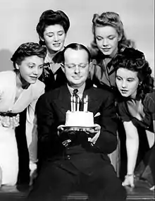 ![]() In 1943, author Clifford Goldsmith and actresses Mary Rolfe, Ann Lincoln, Mary Shipp, and Charita Bauer posed with a cake in celebration of the fifth anniversary of The Aldrich Family radio program. Goldsmith wrote the show's scripts. | |