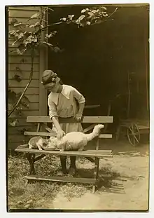 Johnson viewed photography in similar terms to painting and composed his photographs in that fashion. He stated that he selected subjects in the same fashion as he would for paintings and posed them in a way that represent "naturalness of life as I see it." Once the prints were developed, he would "paint on them with great care, blot out, put in, get all the art and suggestion I can into them. Sometimes I paint over almost the entire surface… if you go about it in the right way you can get at realities and the heart of things as you can by no other method."[20]