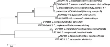 - ↑ Caffara, M., Davidovich, N., Falk, R., Smirnov, M., Ofek, T., Cummings, D., Gustinelli, A. & Fioravanti, M. L. 2014: Redescription of Clinostomum phalacrocoracis metacercariae (Digenea: Clinostomidae) in cichlids from Lake Kinneret, Israel. Parasite, 21, 32. doi:10.1051/parasite/2014034 PMID 24986336 PMC 4078730