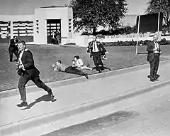 Grant tried to find a seat in the third camera car in the motorcade—the one reserved for local photographers—but it was full; he was then given a spot in the second camera car.[22] Too far back to capture the shooting in Dealey Plaza, Grant's car had just turned onto Houston Street from Main Street "when we heard one shot—pause—two shots in rapid succession."[23] Thinking someone was playing a prank, he gave it no further thought until he saw bystanders on the ground along Elm Street,[23] where he made a photograph from the moving camera car of Bill and Gayle Newman lying atop their children on the grass.[16]