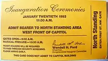The inaugural ceremonies and luncheon for Clinton's inauguration were planned and executed by the Joint Congressional Committee on Inaugural Ceremonies, as all inaugurations since 1901 have been. Senator Wendell H. Ford chaired the committee for Clinton's first inauguration.[13] It is estimated that the committee spent $33 million on the inauguration.[14]