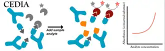 A cloned enzyme donor immunoassay (CEDIA) is a competitive homogenous enzyme immunoassay.[1] This assay makes use of two component fragments of an enzyme which are each individually inactive. Under the right conditions in solution these fragments can spontaneously reassemble to form the active enzyme. For use in biochemical assays one of the enzyme fragments is attached to an analyte of interest. The analyte-enzyme-fragment-conjugate is still able to reassemble with the other enzyme fragment to form an active enzyme. However it is unable to do this if the analyte is bound to an antibody.