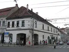 Cluj's first pharmacy was opened in the building in the house on the Main Square (today Piaţa Unirii) in 1573 and was operated by the government. In 1727 it was sold to its first private owner, Alexander Schwartz, than to Tobias Mauksch in 1752. In 1851 it was inherited by the (Transylvanian Saxon) Hintz family and was renamed "Saint George's Pharmacy" (La Sfântul Gheorghe). After the establishment of Communist Romania, the whole building was nationalized, and the pharmacy was closed. The descendants of the once wealthy Hintz family migrated to West Germany in the 1970s.
