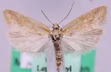 The length of the forewings is 7.5-10.8 mm. Adults are sexually dimorphic. Males have uniform white to yellowish-brown forewings. Females are marked with light to dark brown. In Meyrick it is described - Antennal cilia of male short. Forewings elongate, costa hardly arched, 7 to or close beneath apex; in male whitish-ochreous, unicolorous; in female pale greyish-ochreous, an angulated fascia at 1/3, central fascia with anterior edge excavated in middle and above dorsum, and costal patch suffusedly connected with it beneath costa brownish. Hindwings whitish-ochreous, more or less tinged or suffused with grey, 6 and 7 stalked. The larva is pale yellowish; dorsal and subdorsal lines greenish-grey; spots black; head and plate of 2 pale brown :[4] Julius von Kennel provides a full description.[5]
