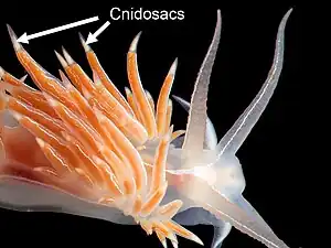 A cnidosac is an anatomical feature that is found in the group of sea slugs known as aeolid nudibranchs, a clade of marine opisthobranch gastropod molluscs.[1] A cnidosac contains cnidocytes, stinging cells that are also known as cnidoblasts or nematocysts. These stinging cells are not made by the nudibranch, but by the species that it feeds upon. However, once the nudibranch is armed with these stinging cells, they are used in its own defense.