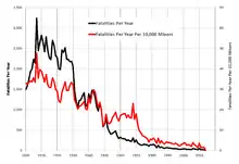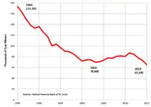US employment in coal mining peaked in 1923, when there were 863,000 coal miners.[46] Since then, mechanization has greatly improved productivity in coal mining, so that employment has declined at the same time coal production increased. The average number of coal mining employees declined to 41,600 in 2020.[1] This was below the previous low of 70,000 in 2003, and the lowest number of US coal miners in at least 125 years.[47][48]