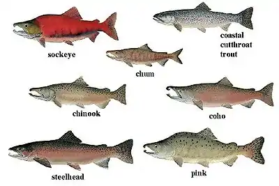 For thousands of years, long before colonization, Coast Salish people have depended on salmon as a staple food source as well as sources for wealth and trade. Salmon is deeply embedded in their culture, identity, and existence as First Nations people of Canada.[1] The five species of Pacific salmon found in waters of British Columbia are Sockeye, Pink, Chum, Coho, and Chinook. They are commonly found in the Fraser, Skeena, Nass, Somass, Thompson, and Adams rivers.[2]
