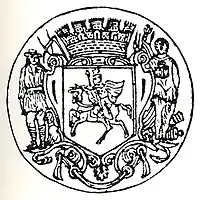 An early heraldic symbol for Bucharest was first used on seals of the town's judet (mayor) and pârgari (town council) as early as the 16th century: it usually featured images of the Madonna and Child or the Annunciation, and was accompanied by an inscription in either Church Slavonic or Romanian, which were simply variations of the phrase "this is the seal of Bucharest".[4]