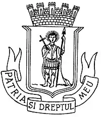 According to Constantin C. Giurescu, Alexandru Ioan Cuza changed the seal to depict the patron saint and an image of the mythical shepherd Bucur.[4] However, it appears that St Dimitrie Basarabov (or St Demetrius) was introduced as a symbol during Cuza's reign (in 1864, as attested by Monitorul Oficial).[2] The arms were enlarged after World War I, when the mural crown and all other present-day elements were added, while the image of Bucur was removed.[4]