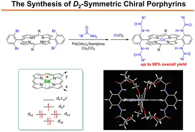 Third, it has been well documented that the physical and chemical properties of a porphyrin complex of a given metal ion can be systematically tuned by introducing peripheral substituents with varied electronic, steric, and conformational environments on the aromatic ring structure of the porphyrin ligand. X. Peter Zhang's group have accomplished porphyrin modification by using palladium-catalyzed coupling processes of chiral amides on bromoporphyrin templates.