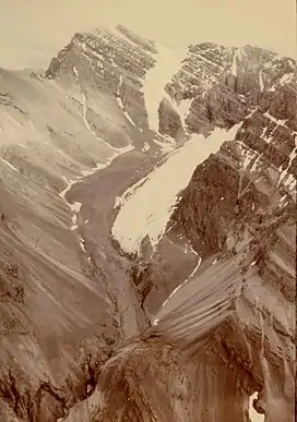 Visitors to Cockedhat have remarked on its "high, jagged peaks wrapped in clouds," and its "vast, sheer mountain walls."[3] The summit of Cockedhat Mountain rises at the intersection of four steep, long ridges. Cirque glaciers, rare in the central Brooks Range, sit in large bowls to the North, East, and West, and a small hanging glacier clings to the peak's steep western face. Only the peak's southern bowl remains free of year-round snow and ice.[1]