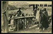 Matters deemed especially serious by the French officials or matters for which the colonial power had any interest were handled by a French administrator-judge. All criminal cases were handled by a tribunaux du premier degré directed by the chef du subdivision (the lowest post held by caucasians) with the assistance of two local notables and two caucasian officials or (in practice) anyone whom the administrator-judge chose. They could be appealed to the tribunal criminal, where the administrator-judge was the local Commandant du cercle and was not bound to heed the advice of even his own appointed assistants.[22] Beyond that, there was no functioning appeals process though in theory, the colonies' governor had to sign off on all decisions that imposed punishments greater than those allowed for summary sentences. Historians examining the court records have found that governors were asked for approval after the fact and in all but a minuscule number of cases signed off on whatever their commandants decided.[23]
