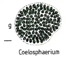 | Colony of Coelosphaerium, g — gas vacuolate Scale bar ~10 µm | |