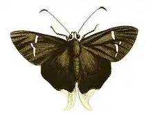 Under side. Palpi white. Breast, abdomen, and wings coloured as on the upper side; the posterior differing merely in having their outward edges bordered with white. Wing-span 2 inches (50 mm).[2]