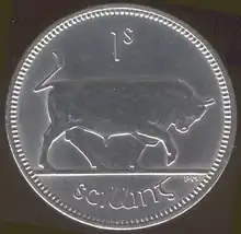 Shilling coins featured a bull design. They continued to be used after decimalisation as five pence until the early 1990s when the 5p coin was reduced in size.