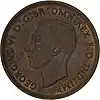 Penny (1d) | 30.8 mm | 9.45 g | Portrait of King George V. Designed by Sir E. B. Mackennal. | At centre within a circle of beads, the denomination "ONE PENNY" in three lines above a plain scroll; around the circle of beads, "COMMONWEALTH OF AUSTRALIA" and date. Designed by W. H. Blackmore. | 1911 | 1911–1936 | |||