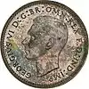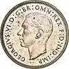 Portrait of King George VI. Designed by Thomas H. Paget. | Three ears of wheat held by a curved ribbon, AUSTRALIA", below divided into two by the stalks of the wheat "THREE PENCE", above, across the middle of the coin the date divided into two by the ears. Designed by George Kruger Gray. | 1938 | 1938–1944 | ||||||