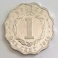 The coins of the Colony of Belize retain the same basic designs as on the coins of British Honduras, but with the country's name changed to "Belize". These coins were struck at the Royal Mint, Llantrisant. A series of numismatic coins, depicting the Belizean Coat-of-Arms on the obverse instead of the Queen's portrait, were struck at the Franklin Mint.[1][2] These coins were generally intended for American collectors, however, and did not circulate in Belize.[2]