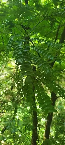 Cojoba costaricensis (common names include Angel's hair) is a species in the Cojoba genus in the family Fabaceae.[2] The native range of this species is Nicaragua to Panama. It is a tree and grows primarily in the wet tropical biome.[3] Occurs commonly in mature forest at 1400-1600m in Costa Rica, especially in Monteverde. 5-15m tall subcanopy tree, with doubly compound fern-like leaves. There are tiny extrafloral nectar glands between each pair of leaflets.[4] Cojoba costaricensis does not close its leaves at night in nyctinistic movement like other legumes.