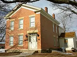 The Col. Gustavus A. Palmer House was built c. 1858 by local stonemason and architect Andrew Jackson Simon. Like Palmer, Simon had come to McHenry County from New York. The house is an eclectic blend of popular styles, dominated by Neoclassicism. The house is built with brick with a two-story front section and a one-and-a-half-story rear. Typical of the Federal Style, the house features broken pediment and a low-pitch gable. The gable features a dentilated cornice. Also typical of the style, the house features an off-center main entrance and large windows. Greek Revival influences are found in the heavy sills and limestone lintels surrounding doors, windows, and the water table. The foundation is a typical New England cobblestone masonry. The west elevation has an open air porch. The house has thirty windows—five on the south, ten on the west, one on the north, four on the east, and ten basement windows. The interior features plaster walls and southern yellow pine floors. There are no fireplaces. The first floor interior is a standardize style known as a sidehall. The floor is split into two large rooms that each feature a smaller room. The south side was the main entrance and featured the staircase. The rear featured access to the attic and basement. The second floor is not standardized, featuring five rooms and a closet.[2]