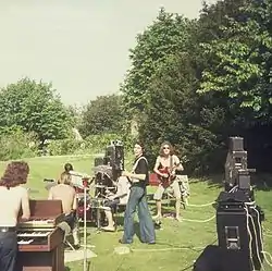 Band Lineup, Hereford Cathedral Cloisters, 1974 (left to right) Will Wright, Paul Cheshire, Pete Farndon, Phil Weaver, Tic Taylor, Pedro Brown, Helen Hardy