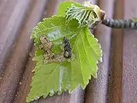 The larvae feed on silver birch (Betula pendula) and downy birch (Betula pubescens). In its final stage the larva lives in a pistol shaped case, that with a mouth angle of 30°-45° is standing obliquely on the leaf.