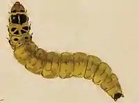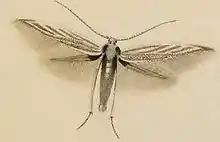 The larvae feed on Silene nutans, Silene otites, Silene italica, Arenaria grandiflora, Cerastium arvense and Lychnis viscaria. Silene nutans can sometimes be found in the UK National Vegetation Classification habitat communities: the very widespread MG1 (Arrhenatherum elatius grassland), and thus can be found where Arrhenatherum elatius, (also known as false oat grass), and/or Dactylis glomerata, (cock's-foot), occurs.[2] They create a trivalved, tubular silken case of about 12 mm (0.47 in) long. The case is yellowish white, with several characteristic dark length lines. The mouth angle is about 40°.[3]