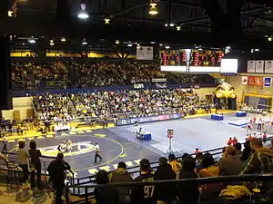 The main official at the wrestling match is the referee, who is in full control in matters of judgement at the competition and is responsible for starting and stopping the match; observing all holds; signaling points; calling penalties such as illegal holds, unnecessary roughness, fleeing the mat, or flagrant misconduct; and finally observing a full view of and determining the fall.[45] There can also be one assistant referee (especially at tournaments) that helps the referee with making any difficult decisions and in preventing error.[46] Also, scorers are there to record the points of the two individual wrestlers. Finally, a match or meet timekeeper with assistant timekeepers are present to note the match time, timeouts, and time advantage and work with the scorers.[47]