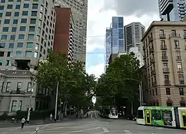 | Looking west down Collins Street from the Old Treasury Building, Spring Street | |