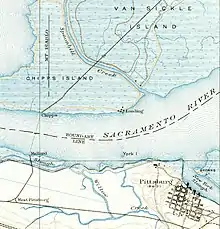 Collinsville is a rural unincorporated community in Solano County, California, United States. It is located at the mouth of the Sacramento River, on the north side of the river where it debouches into the Suisun Bay.[1] Collinsville is effectively separated from the more intense urban development in Contra Costa County immediately across the river, as no bridge exists connecting the two areas. The area was once proposed for a major chemical plant of the Dow Chemical Company in the 1980s.[2] The community is in ZIP code 94585 and area code 707.