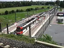 The Cologne–Aachen high-speed line is used by numerous freight trains due to its location between the Köln-Eifeltor freight yard on the West Rhine railway and Aachen West, the eastern end of the Aachen–Tongeren railway. Much of the freight traffic is carried by DB Cargo and Cobra (Corridor Operations Belgium Rail), a subsidiary of Deutsche Bahn, and SNCB.[69] Other regular services are a SBB Cargo Combined transport train hauled by TRAXX locomotives and freight trains operated by Crossrail (now part of Cargologic) and RTB Cargo,[70] which uses diesel-hauled goods exchange trains (Übergabegüterzuge) from Düren to Stolberg and back. The line is also used by freight trains to and from Mönchengladbach on the section between the Cologne-Ehrenfeld and Köln-Müngersdorf Technologiepark stations.
