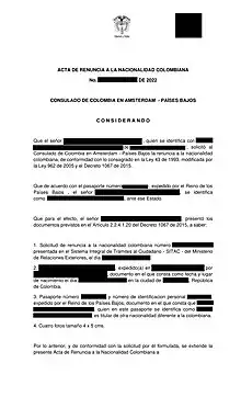 Colombian citizens can renounce their nationality. The process of renunciation requires the citizen to appear at a Colombian embassy or consulate if the petitioner lives outside of Colombia, or at the Ministry for Foreign Affairs if the petitioner resides in Colombia. To start the process of renouncing Colombian nationality, the petitioner must hold a nationality from a different country.[7]
